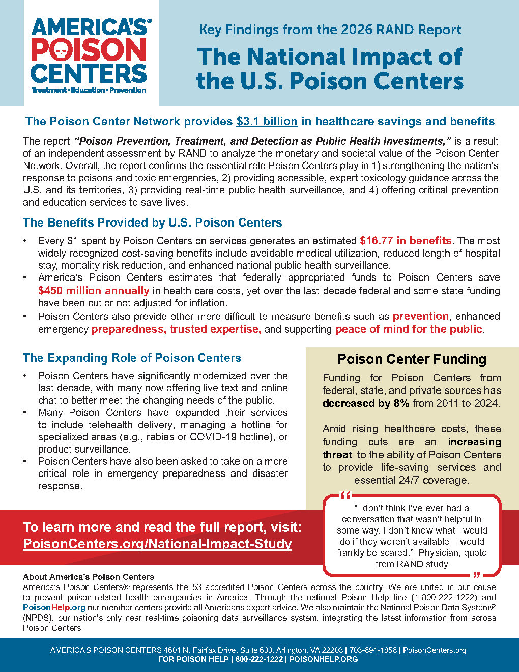 The RAND study, Poison Prevention, Treatment, and Detection as Public Health Investments, analyzed the economic and public health impact of U.S. Poison Centers and confirmed their value to communities across the country.